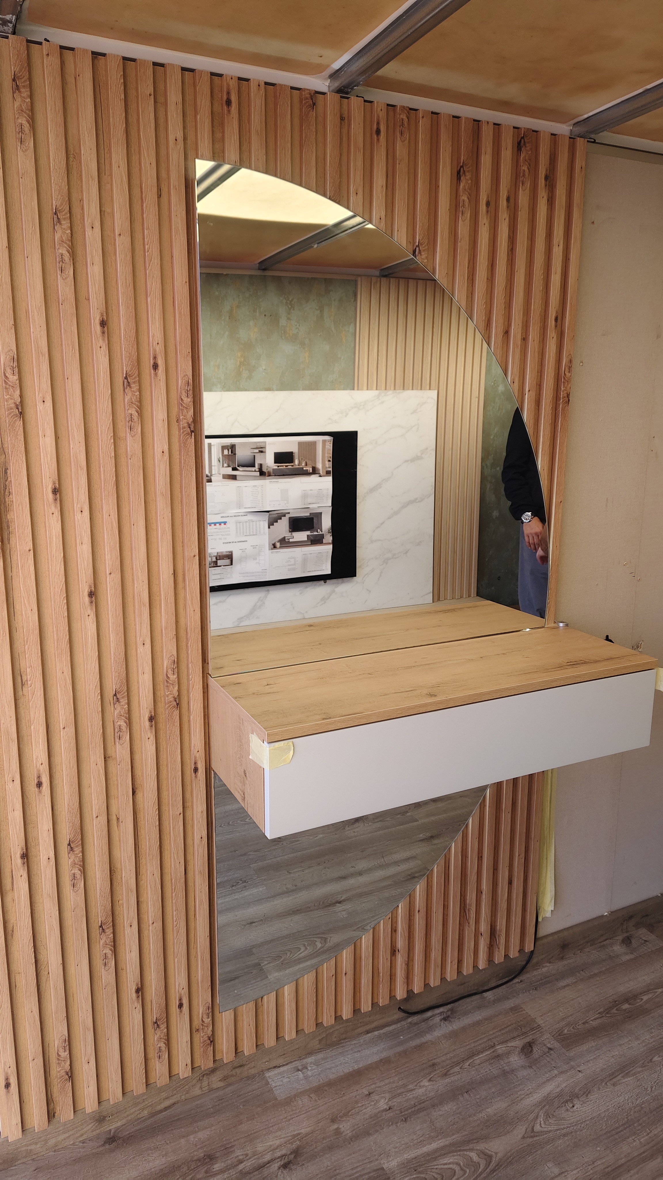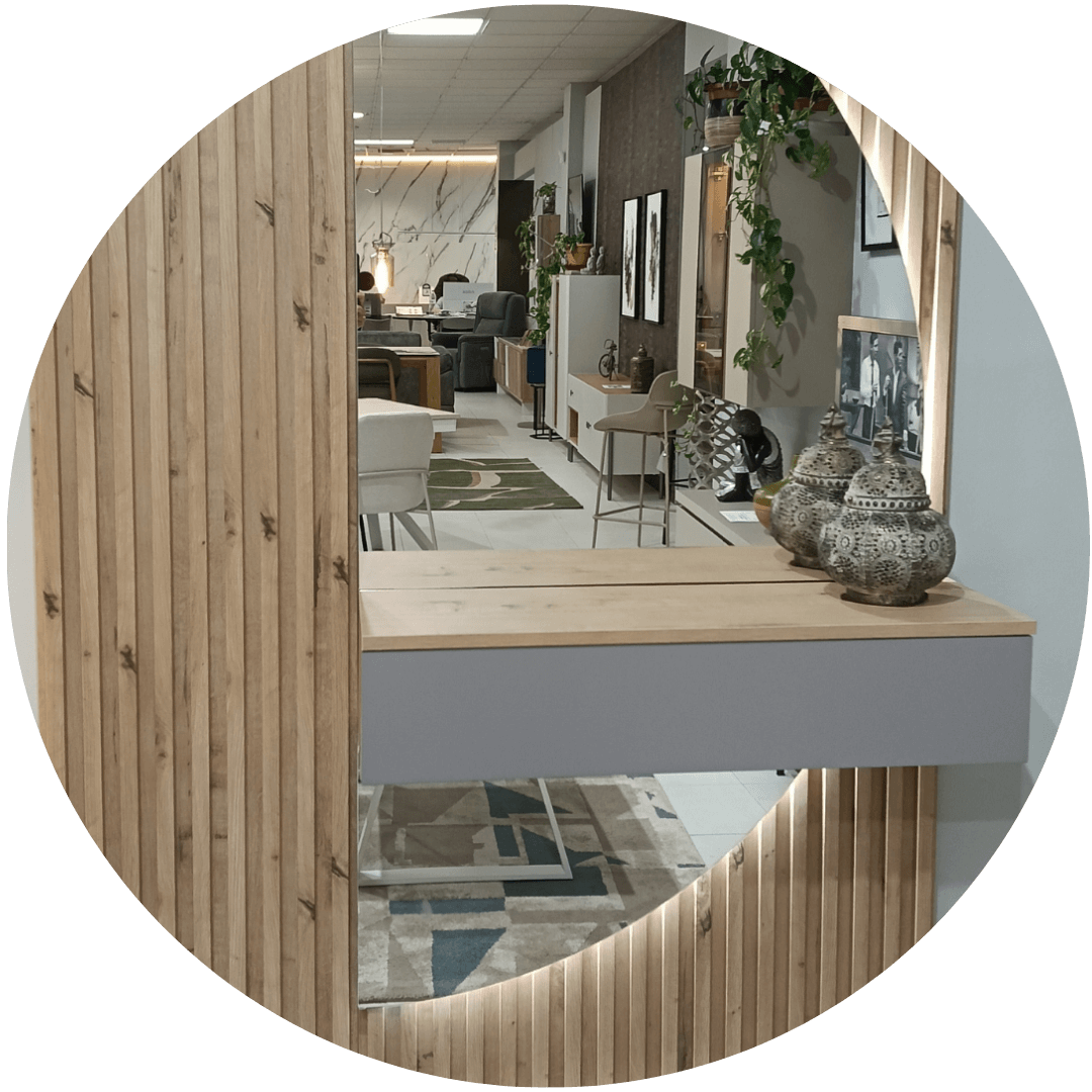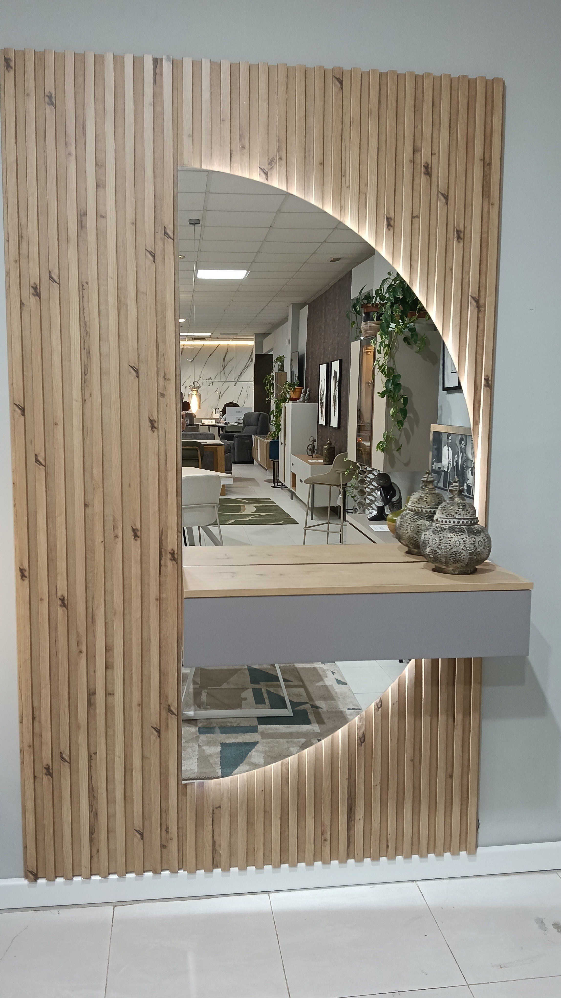 Recibidores espejo media luna + fondo palilleria y cajon colgante