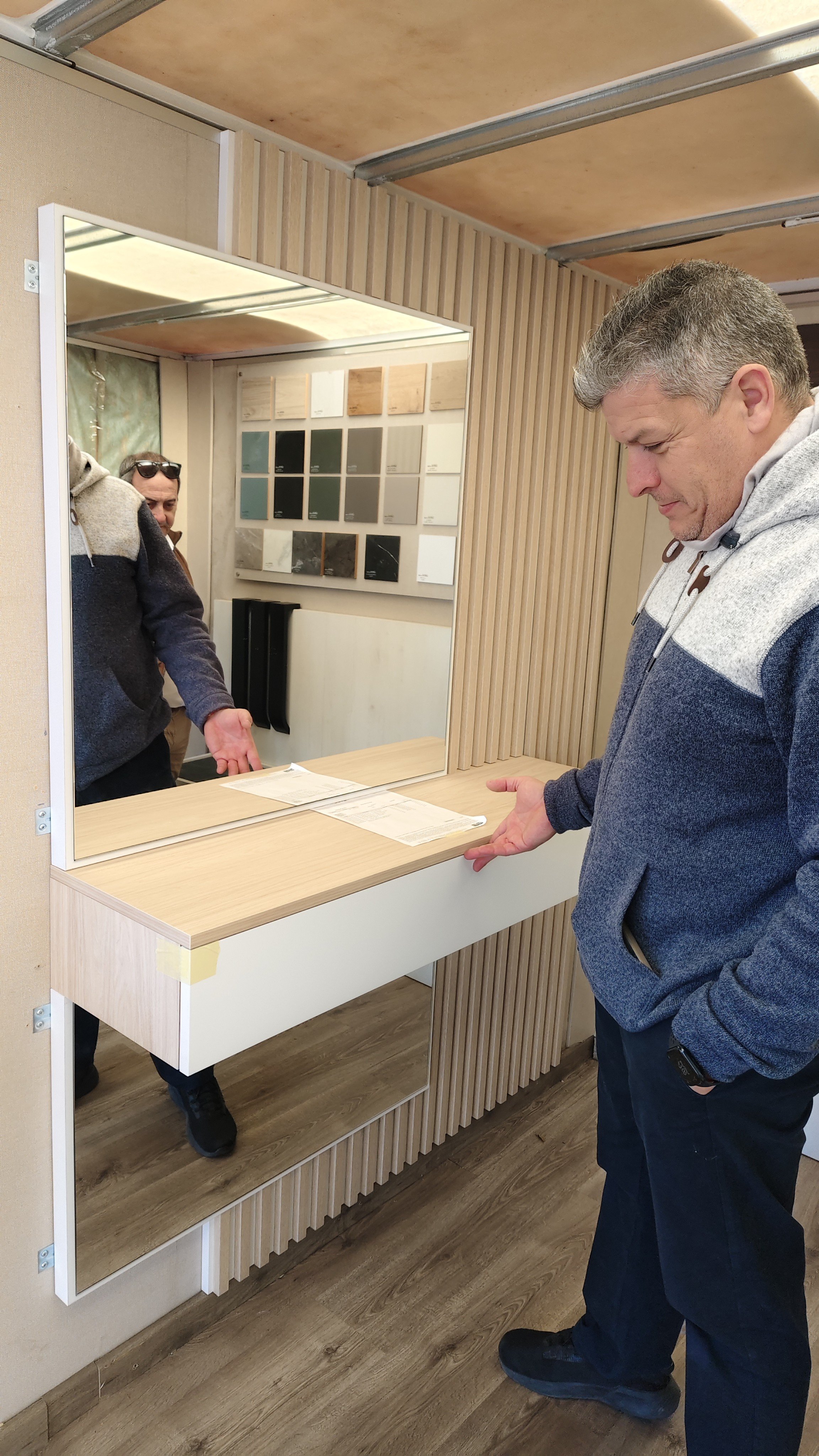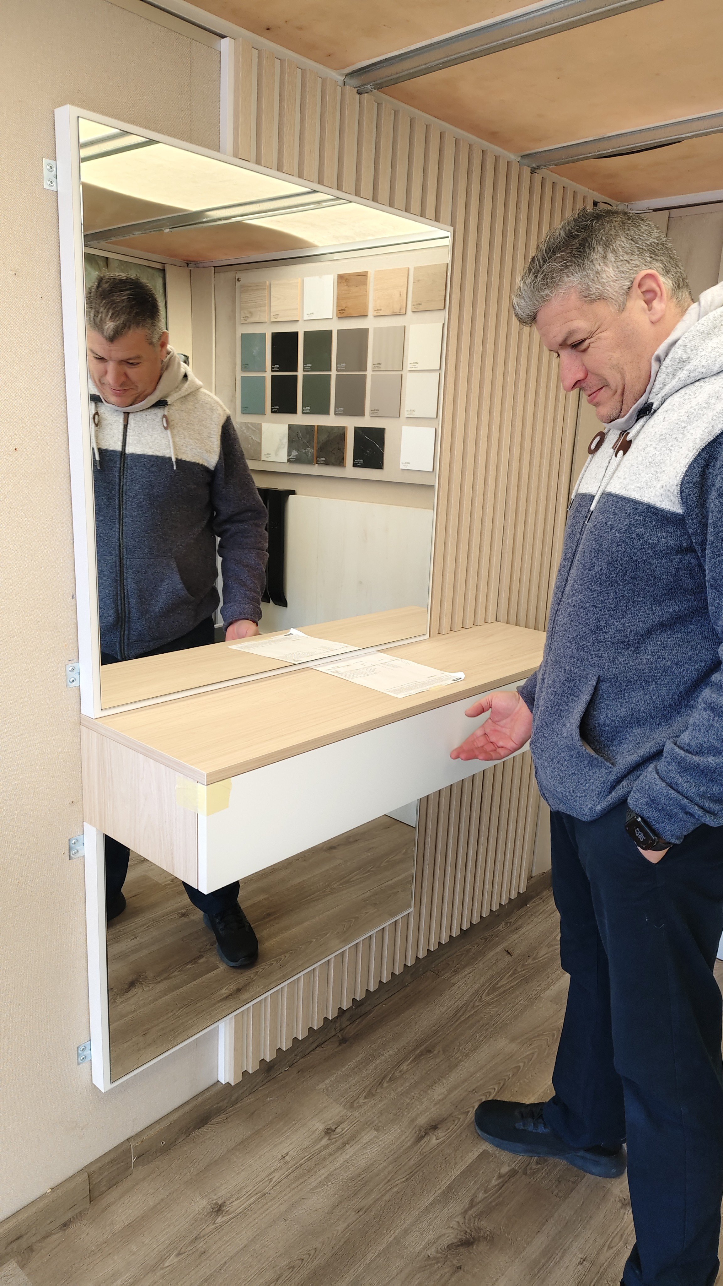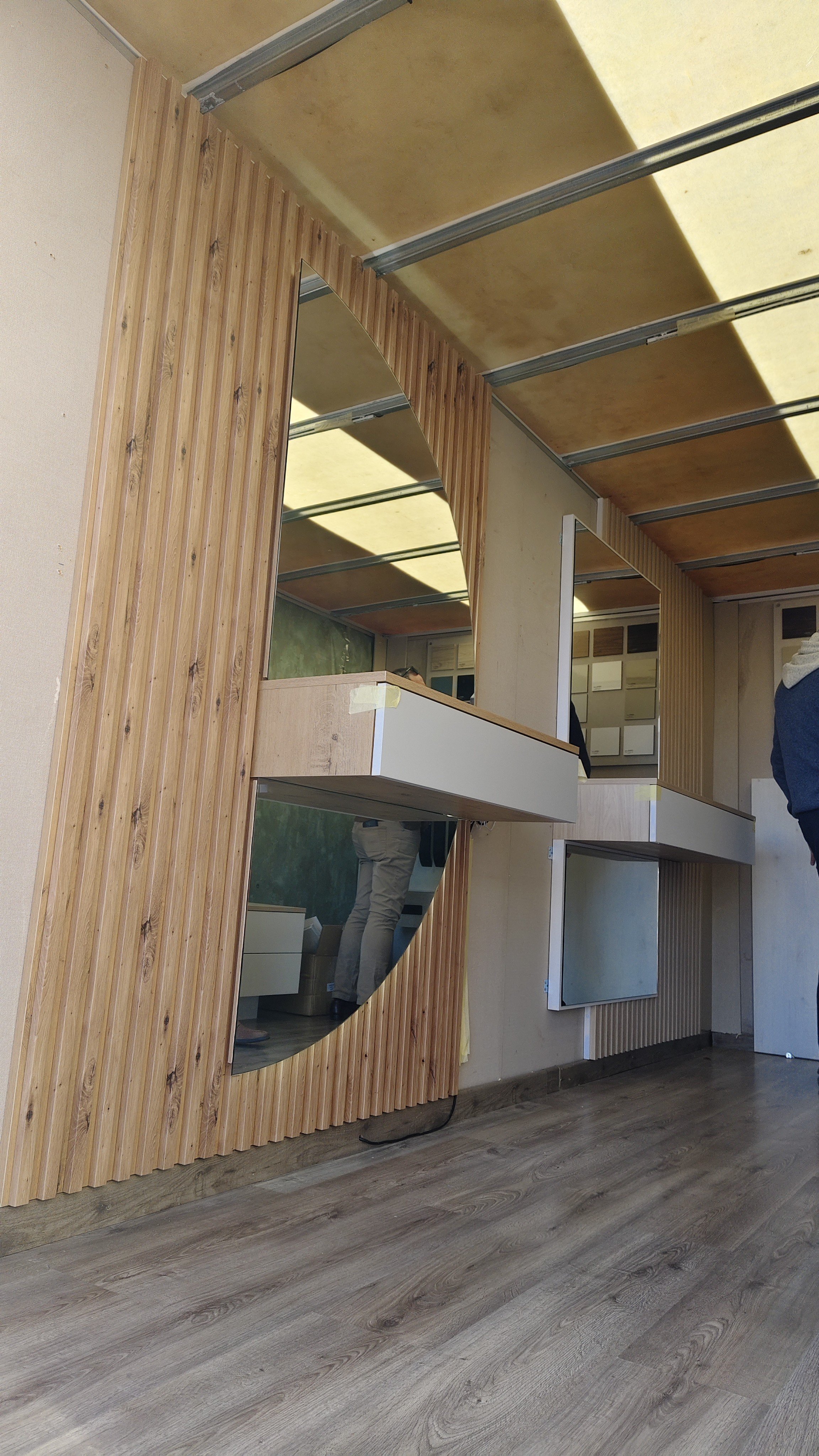 Recibidores espejo media luna + fondo palilleria y cajon colgante