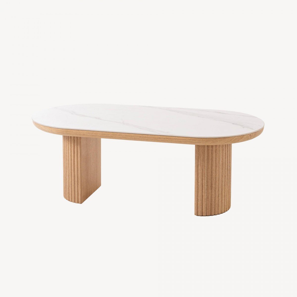 La mesa de centro de 120 x 45 x 60 cm combina estilo contemporáneo, funcionalidad y materiales de alta calidad. Su tapa de porcelánico blanco aporta luminosidad, elegancia y resistencia, siendo fácil de limpiar y perfecta para el uso diario. El pie de chapa de roble con palillería añade un detalle visual sofisticado y natural que aporta calidez y carácter al salón. Esta estructura robusta garantiza estabilidad y durabilidad, manteniendo el mueble seguro frente a uso diario. Ideal para colocar frente al sofá, ofrece espacio para bandejas, libros, objetos decorativos o bebidas. La combinación de porcelánico y madera asegura un diseño elegante y resistente que se integra en cualquier ambiente moderno.