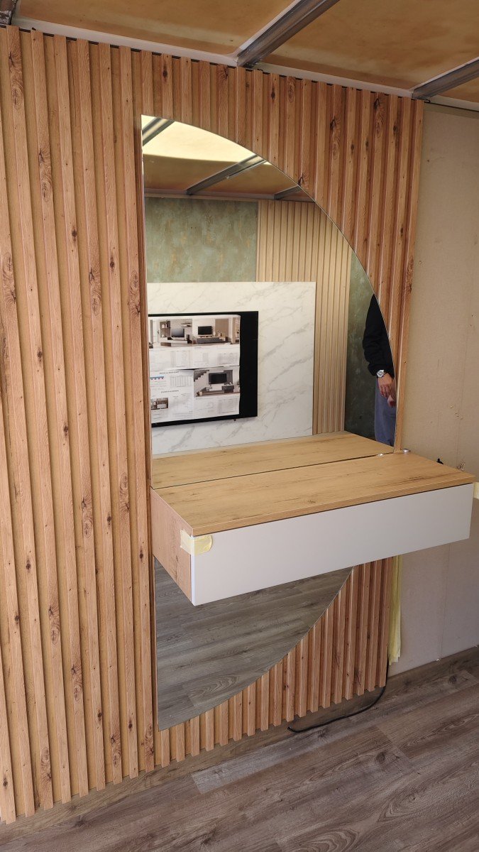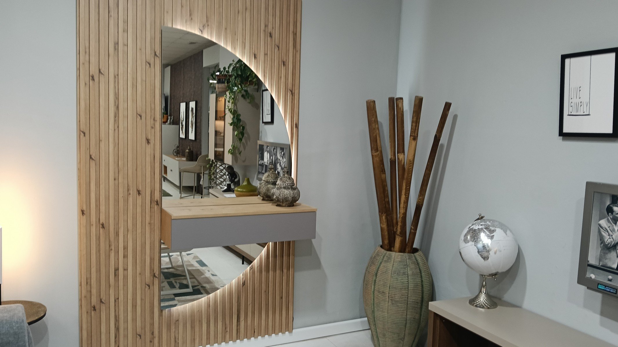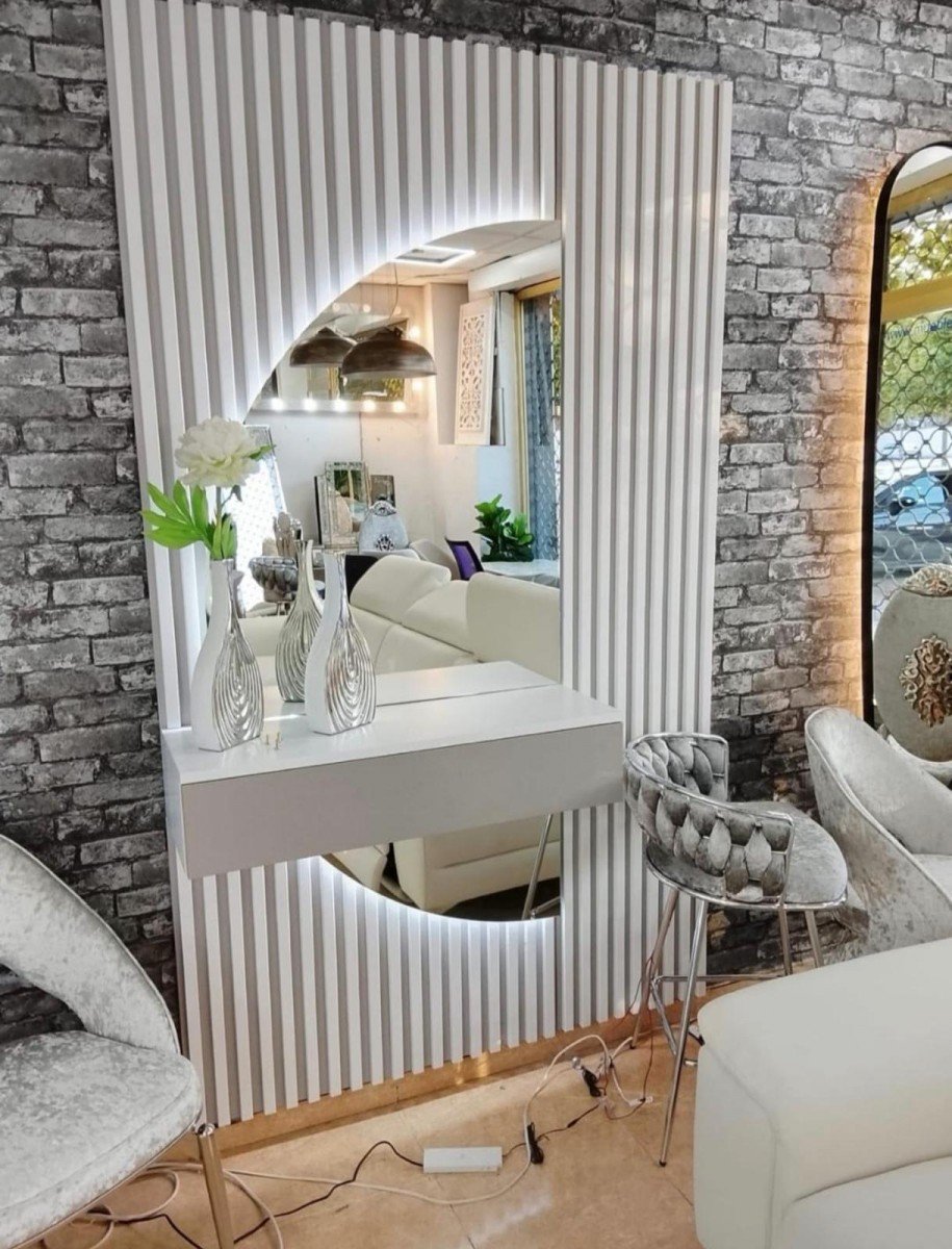 Conjunto recibidor con cajón colgado, que destaca por el espejo media luna con luz táctil.