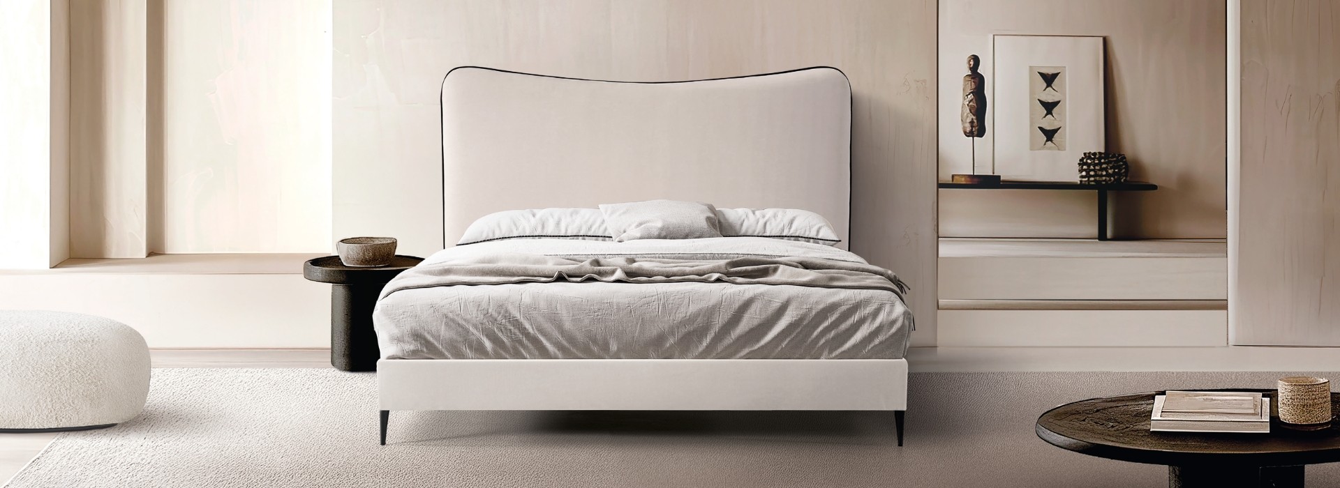 Cabezal tapizado con bordon, disponible para todas las medidas de cama, con un toque de diseño romántico.