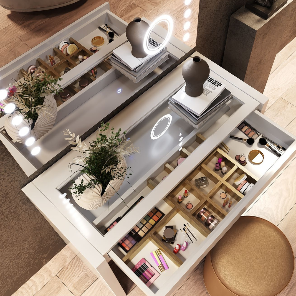 Lo que realmente destaca en el TO54 es su diseño minimalista, que aporta un aire limpio y moderno. En el centro, un cajón compartimentado permite organizar maquillaje y accesorios con facilidad, mientras que la tapa transparente proporciona una vista clara del contenido, manteniendo todo accesible y ordenado.