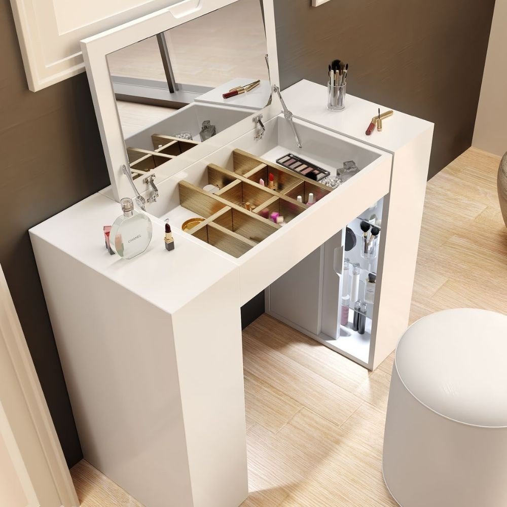 Tocador TO50 perfecto para ambientes pequeños, provecha caa centimetro, las patas de 20 cm de ancho cuentan con almacenaje con puertas correderas.