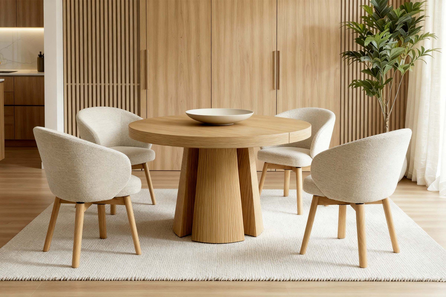 La silla VIRGINIA es la definición de calidez moderna. Su diseño envolvente y acogedor se alza sobre unas elegantes patas de madera de haya, cuya tonalidad natural añade un toque orgánico y atemporal al conjunto.
