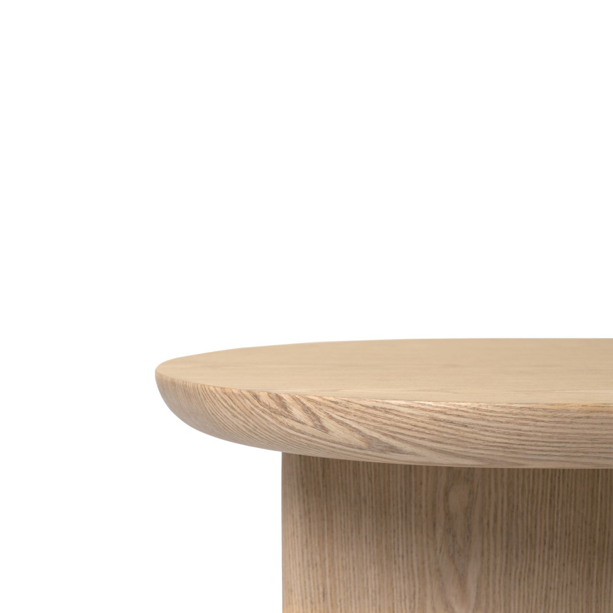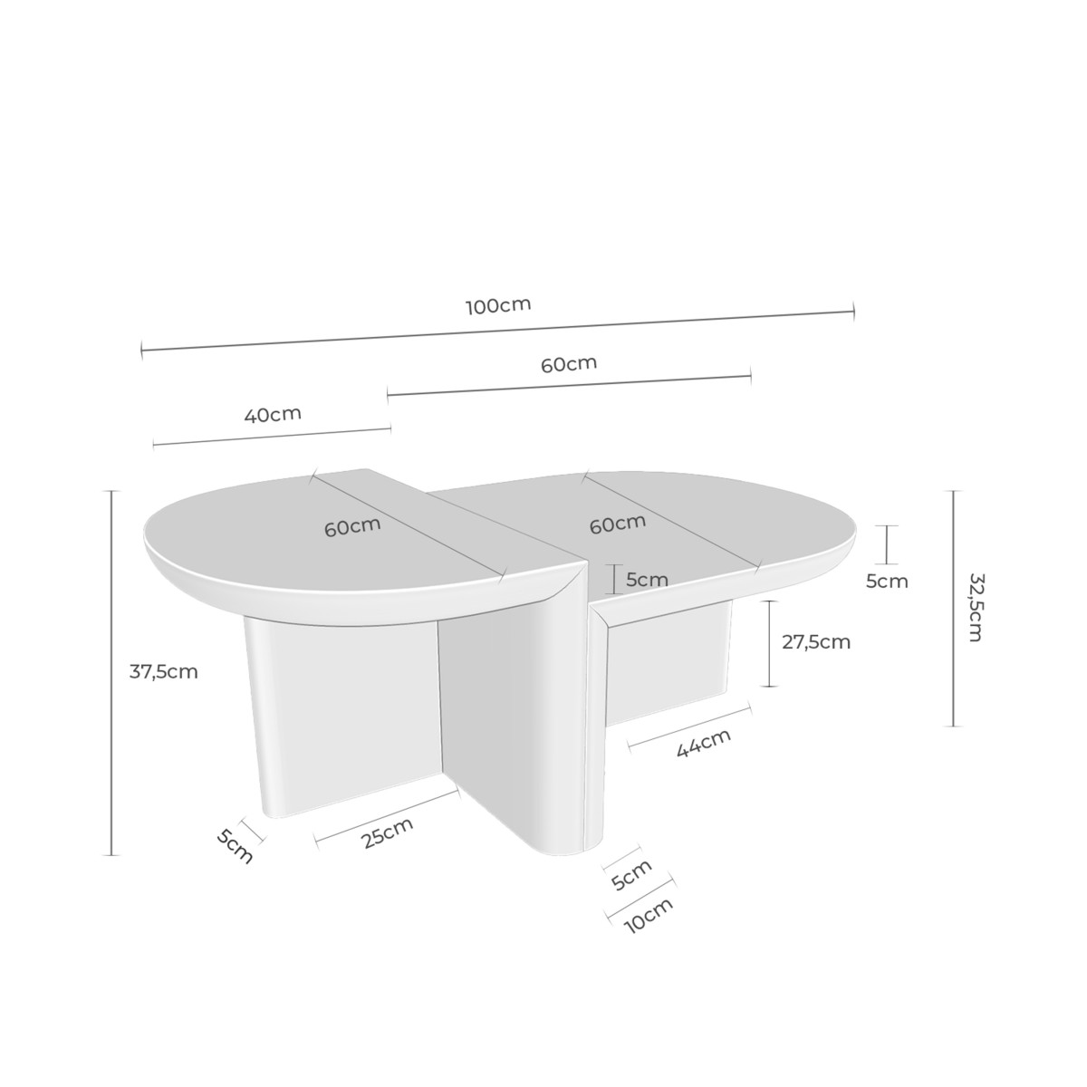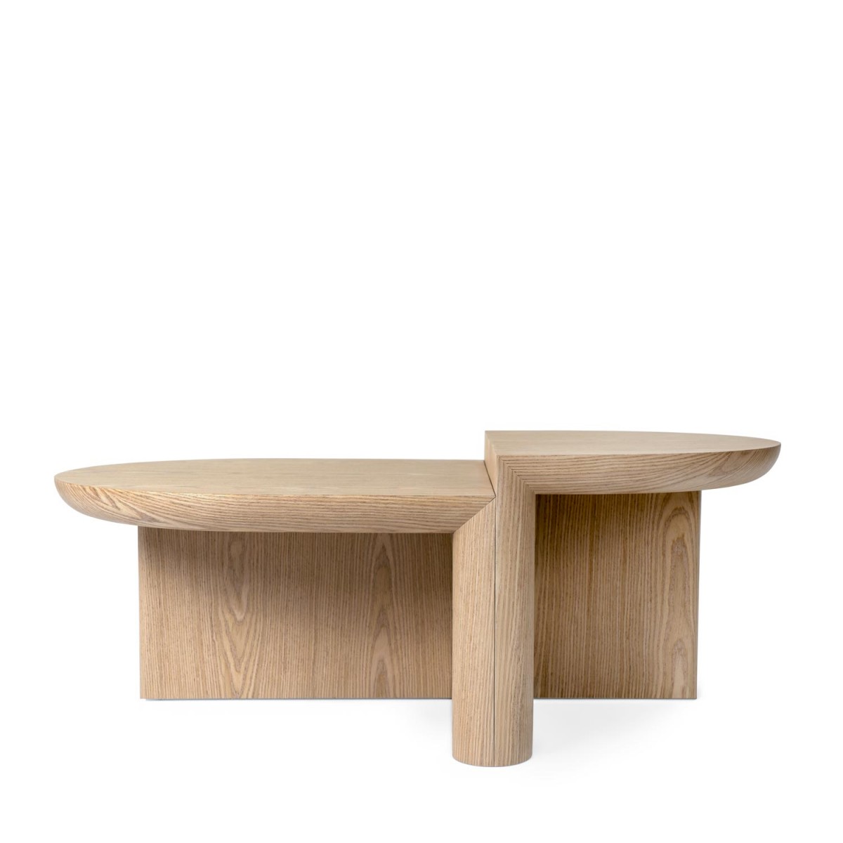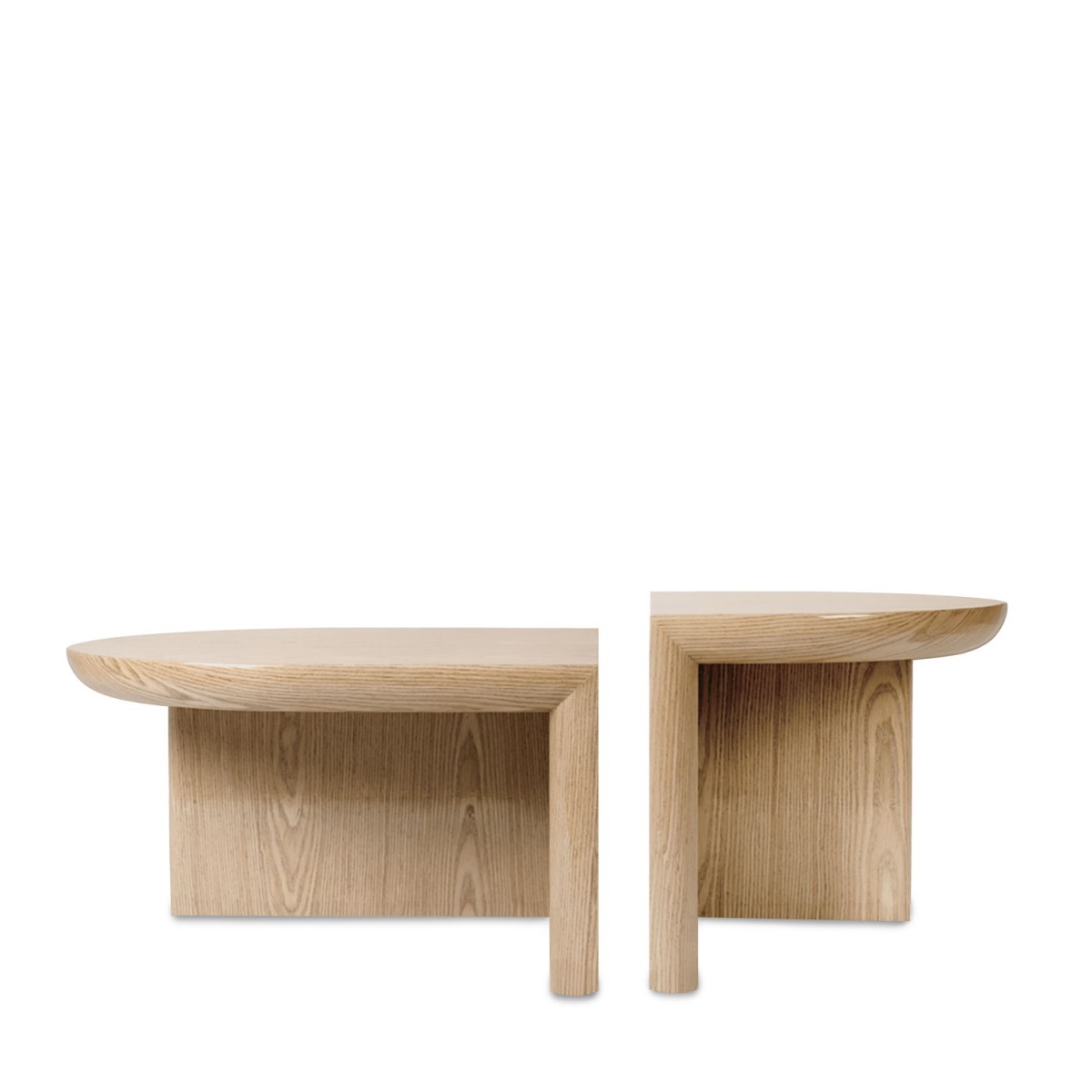 2 mesas en 1, fabricada en chapa de madera con acabado roble, resalta las vetas naturales del material, aportando calidez y textura visual. Su base robusta refuerza la estabilidad del conjunto y acentúa su carácter escultórico, convirtiéndola en una pieza ideal para salones modernos o ambientes de inspiración natural.